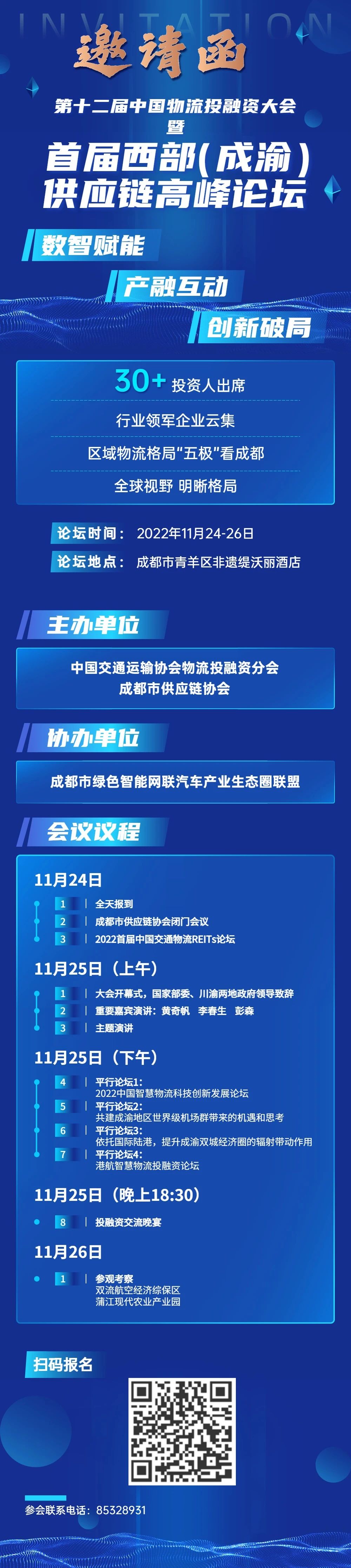 由中国交通运输协会物流投融资分会与成都市供应链协会联合主办的“第十二届中国物流投融资大会暨首届西部(成渝)供应链高峰论坛”将于2022年11月24日-26日在成都召开。