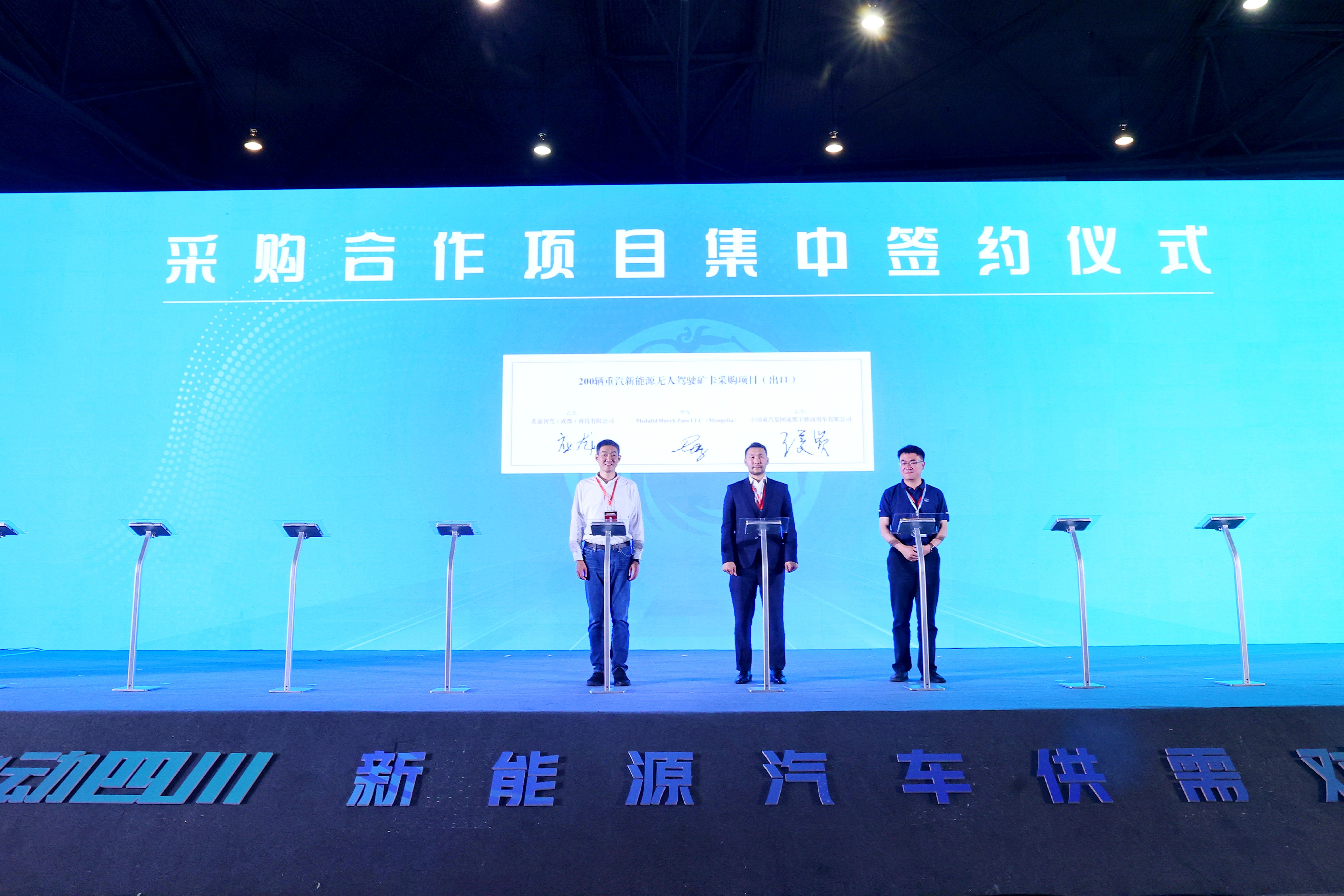 会上,举行了采购项目集中签约仪式,共有40余户企业签署了44个新能源汽车和零部件采购协议,累计采购成都造新能源出租车、网约车、驾考驾培车、物流车、冷藏车、渣土和混凝土运输车共计6050辆,采购成都造汽车零部件5.07万套,签约金额高达66.5亿元。其中希迪智驾(成都)科技有限公司、中国重汽集团成都王牌商用车有限公司与蒙古国Medalid Hureh Zam LLC共同签署了200辆重汽新能源无人驾驶矿卡采购项目,为“成都造”新能源汽车出口再拿一笔大单。
