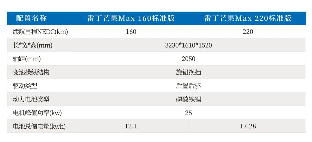 在动力和续航方面,雷丁芒果Max搭载的电机最大功率为25Kw,分别与之匹配的电池容量为12.1Kw和17.28Kw的磷酸铁锂电池,对应的最大续航里程分别为160Km和220Km。在日常出行中,无论是下班代步、日常购物、个人休闲出行,雷丁芒果Max都能一一满足。