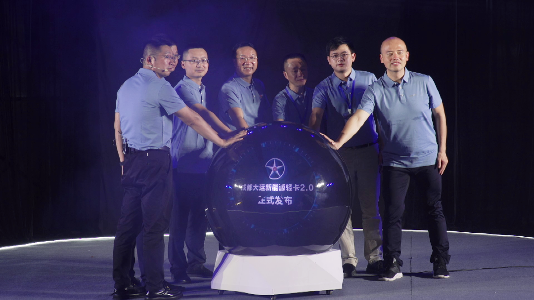 随后,成都大运汽车谢总、邹总等核心领导与来自成都市经济和信息化局、成都市汽车产业生态圈联盟、成都市经开区经济和信息化局的多名重要领导同时登台,共同启动大运新能源2.0启动球,大屏幕上同时勾勒出大运新能源2.0的车身轮廓,三台全新大运新能源卡车从幕布后缓缓驶出,现场响起了经久不息的掌声。